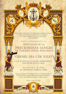 La Hermandad de la Sangre celebra el próximo viernes, día 1 de julio, la festividad de la Preciosísima Sangre de Nuestro Señor Jesucristo. Lo hará con una Santa Misa a las 20:30h en la Parroquia Mayor de Santa Cruz, oficiada por Francisco Reina Chía, párroco y director espiritual de la Hermandad.